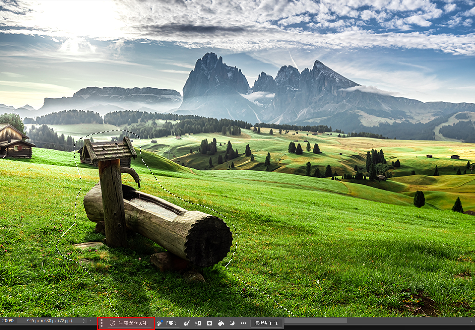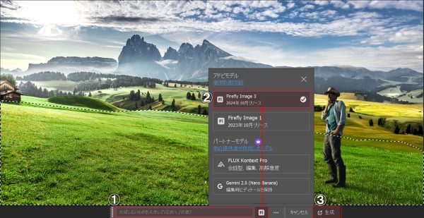 手前のオブジェクトを削除したいので、オブジェクトの選択範囲を取ってから、「生成塗りつぶし」を実行します。