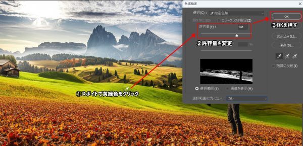 奥側の黄緑色の部分をスポイトでクリックし、許容範囲を調整して OK を押します。