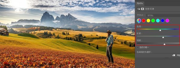 主に色相で色合いを調整し、必要に応じて、彩度、明度を調整します。