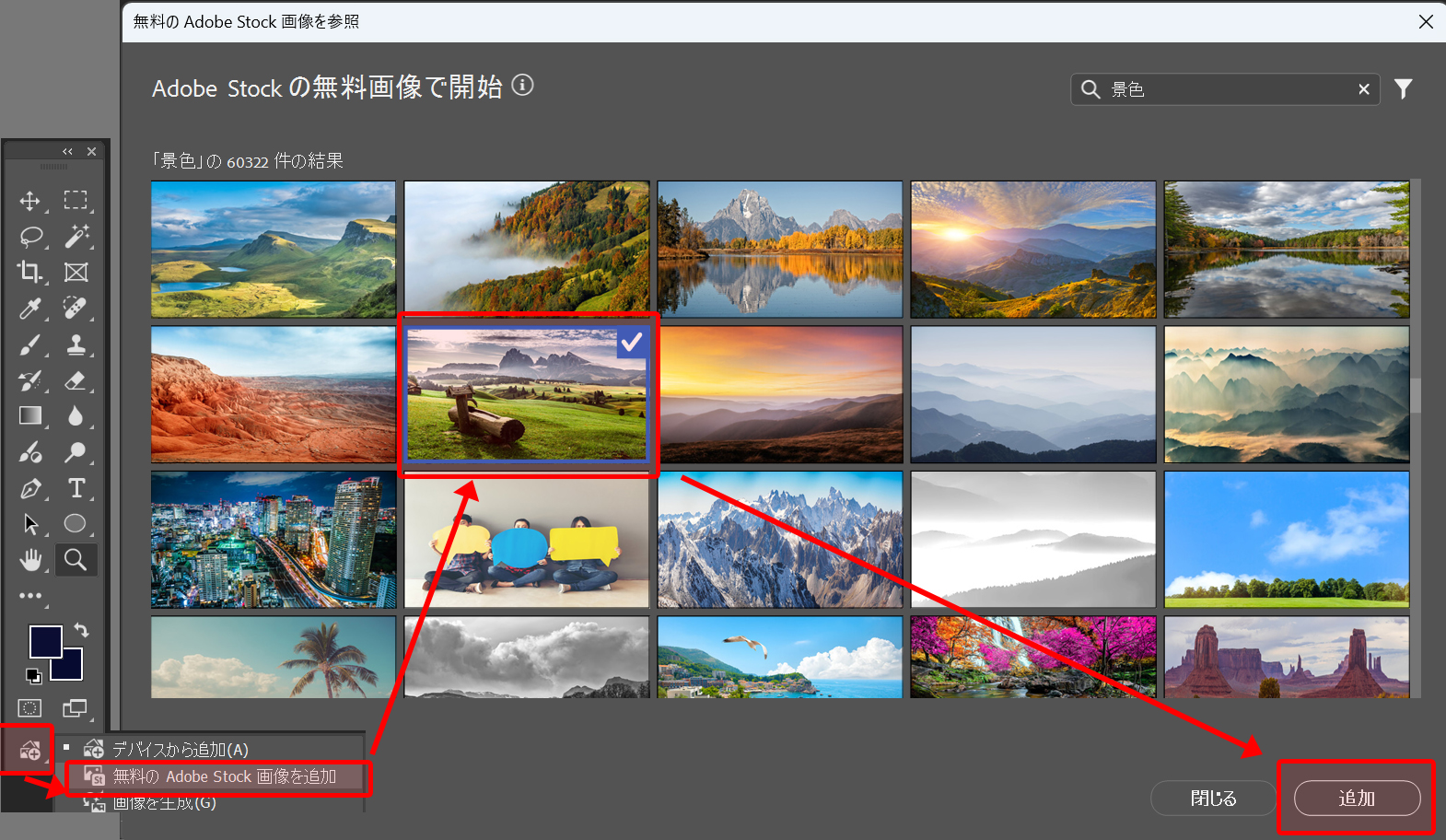 まずは背景を用意します。ツールバーから「無料のAdobe Stock画像を追加」を選択します。気に入った背景画像を選択後、追加ボタンを押します。