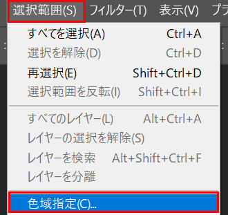 奥側にある黄緑色の草を、秋らしい赤茶色に変更します。選択範囲から『色域指定』を選択。