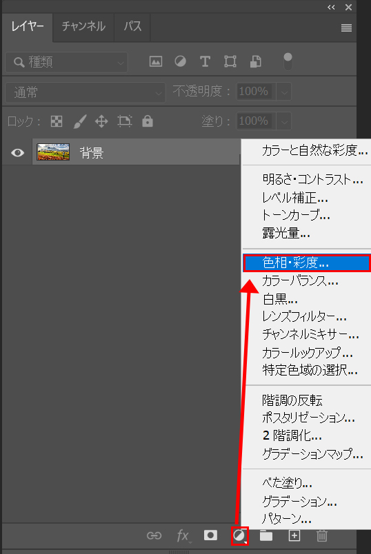 この状態で「色相・彩度」の調整レイヤーを作成します。