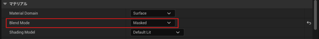 コンテンツブラウザで新しくマテリアルを作成した後、マテリアルを開きBlend ModeをMaskedに変更します。