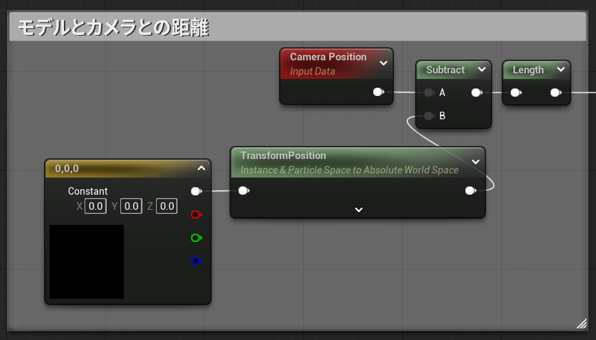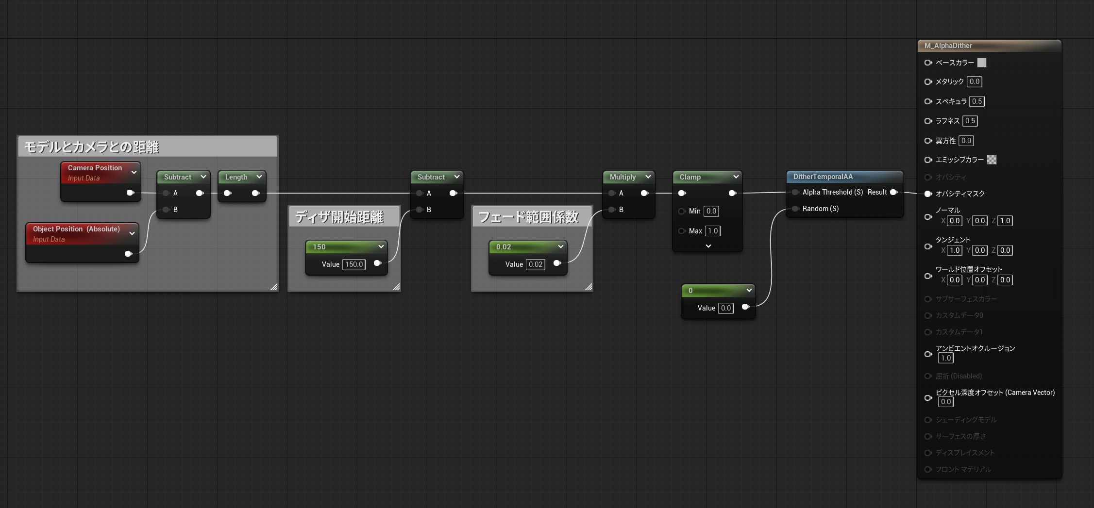 下のように、モデルの座標とカメラの距離からディザ処理ができるようにノードを組みました。