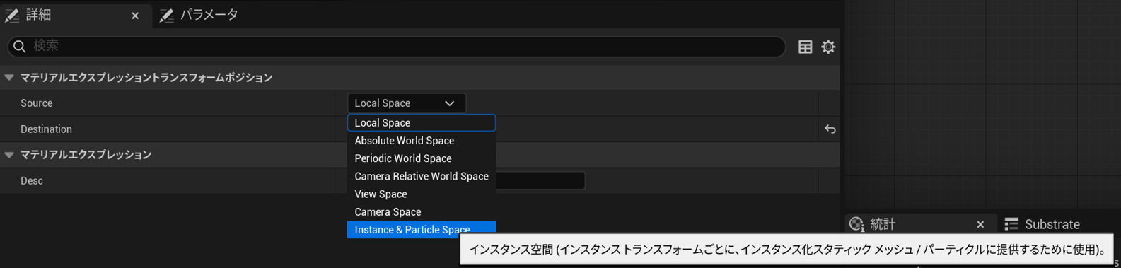 TransformPositionの選択した状態で詳細→マテリアルエクスプレッショントランスフォームポジション→Sourceを「Instance & Particle Space」に変更します。