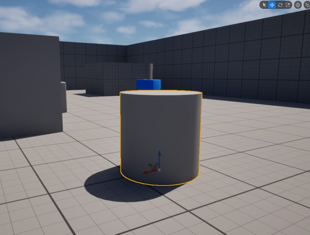 さっそく障害物となるモデルをレベルに配置していきましょう。スターターコンテンツ内の「Shape_Cylinder」をレベルに配置し、詳細のコリジョンプリセットからCameraを無視するように設定します。