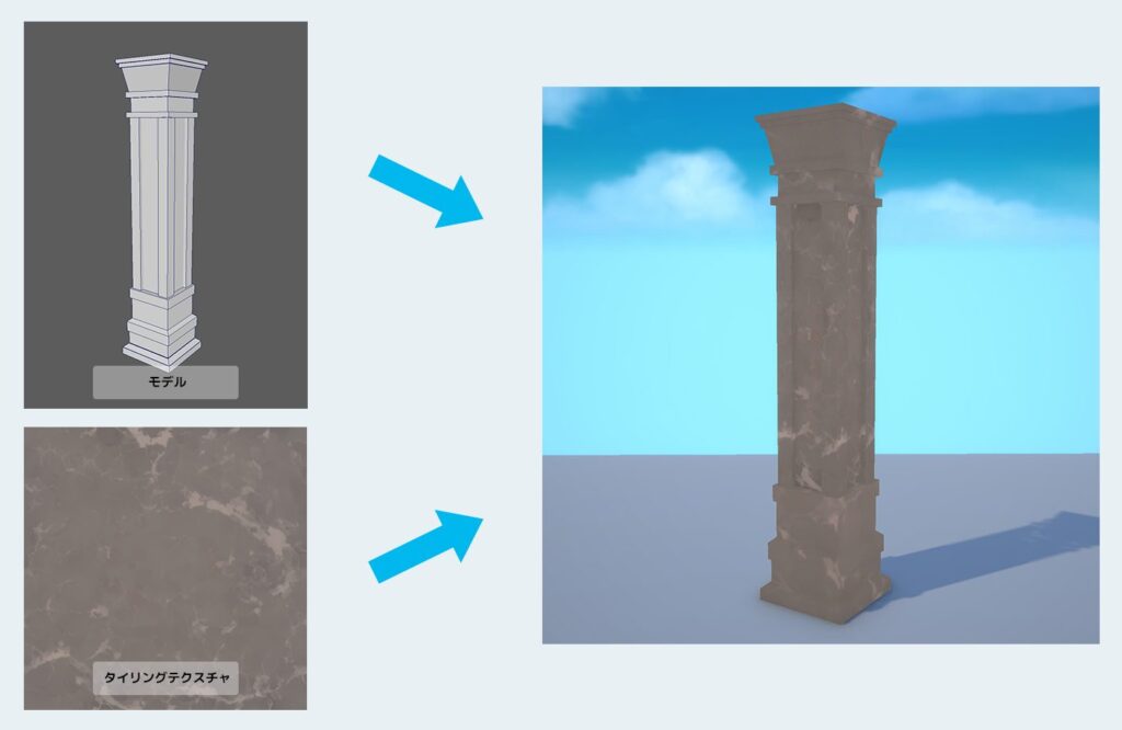 壁・床や、広大な地形などのモデルに1枚のテクスチャをリピートして表示する「タイリング(リピート)」という手法があります。