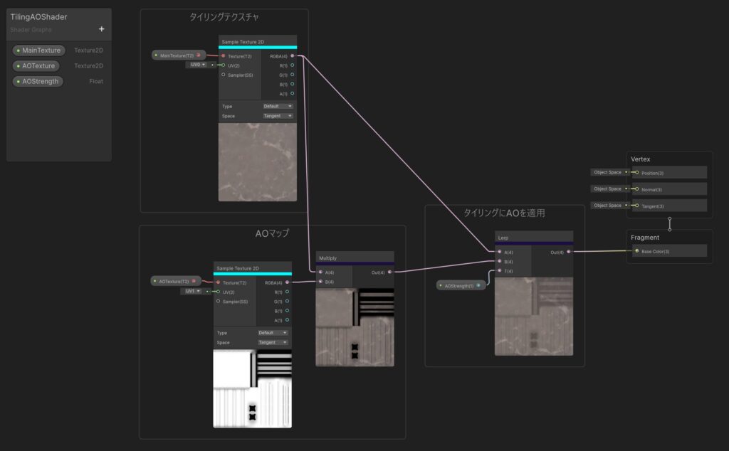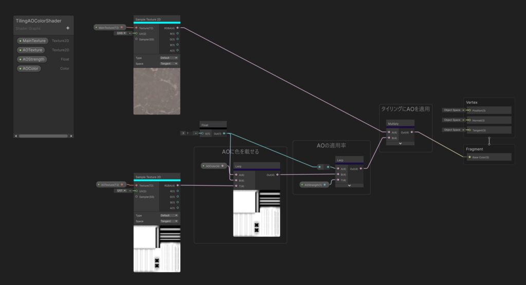 タイリングテクスチャとAOのブレンドにはLerpノードを使用します。