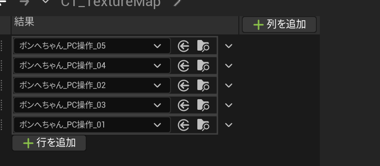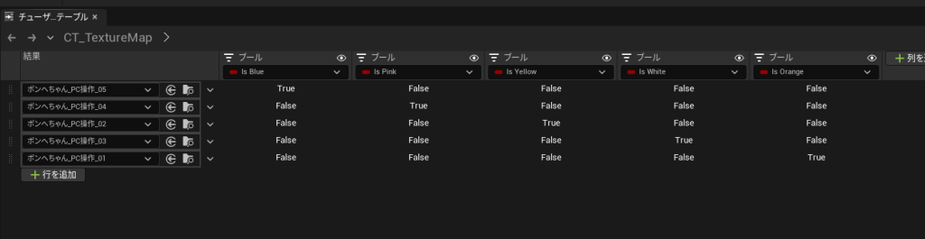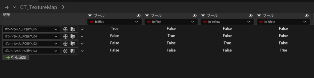 最終的には、行ごとの取得したいアセットに合わせて、各boolの設定を行いました。