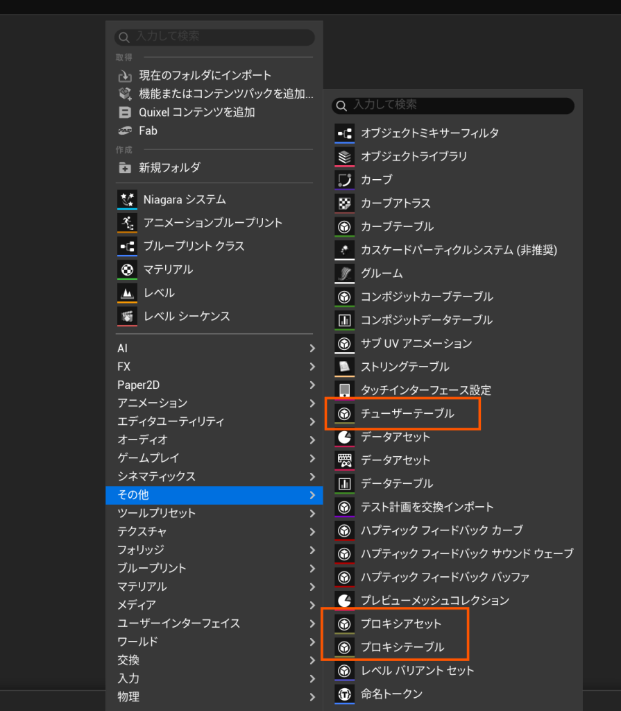 それぞれコンテンツブラウザを右クリックし、「その他」の項目から作成することができます。