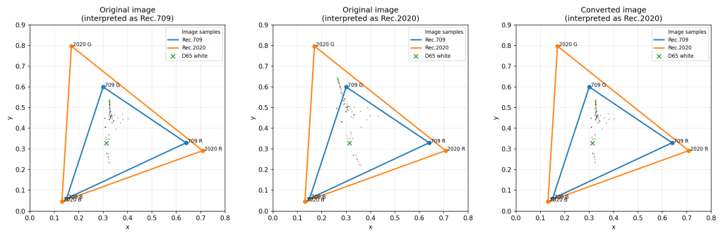以下は、左から「元画像」「RGB 値をそのまま Rec.2020 として解釈した場合の sRGB プレビュー」「Rec.709 → Rec.2020 に変換した後の sRGB プレビュー」の比較です。