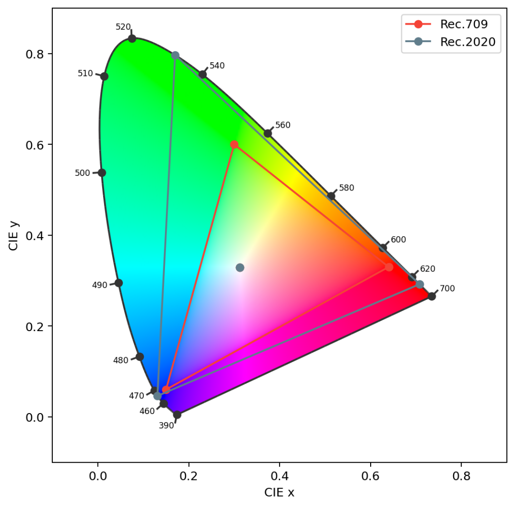 Rec.2020 の原色は色度図上でより外側に位置するため、Rec.709 より広い色域を持ちます。