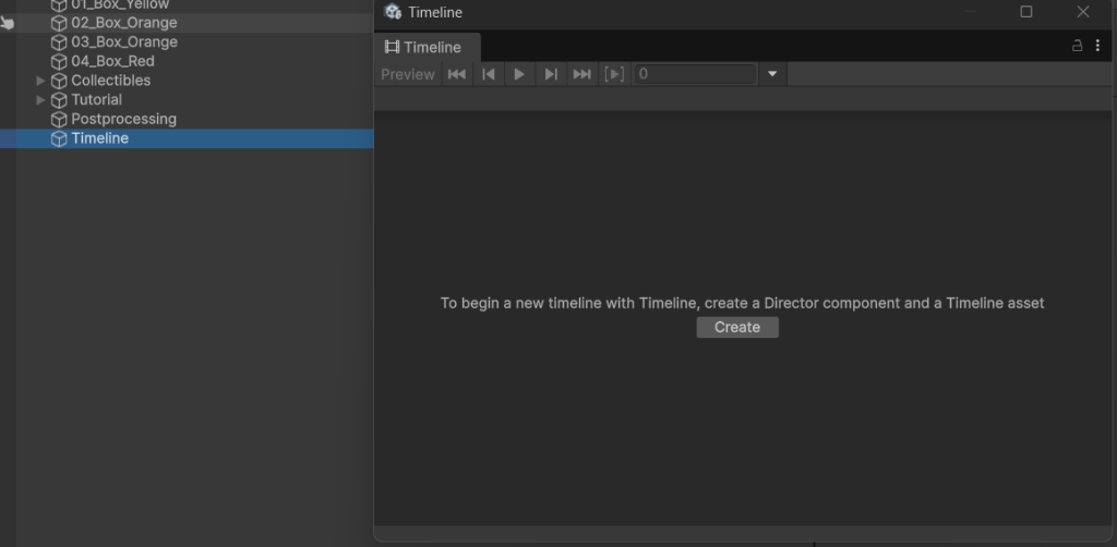 適当な空のGameObjectを作成して、これにTimelineの設定ができるようにしていきます。(名前をわかりやすくTimelineにしました)