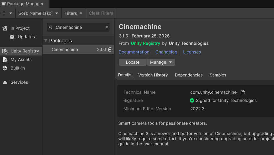 Get Started With UnityにはすでにCinemachineパッケージがインストールされているようです(2026/04/02現在)が、せっかくなのでアップデートしておきましょう。