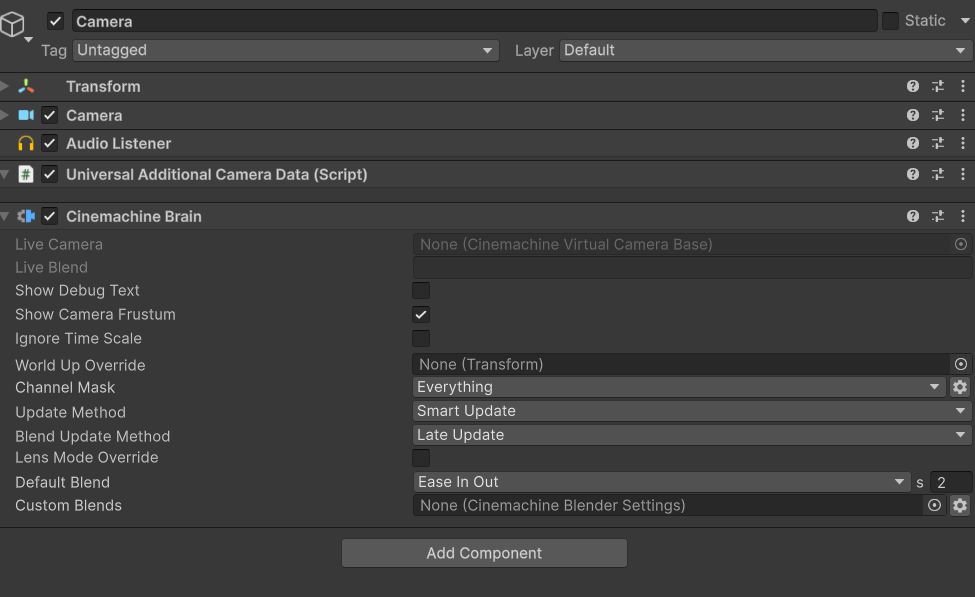 Cinemachine Brainはカメラ本体にアタッチするコンポーネントで、これを通してCinemachineがカメラを制御します。