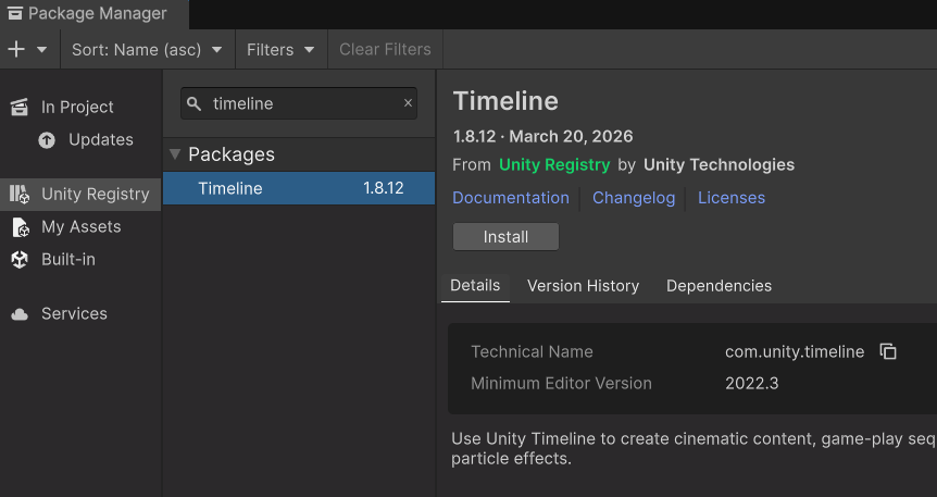 Get Started With UnityにはTimelineが最初から入っていなかったので、PackageManagerからTimelineをインストールしましょう。