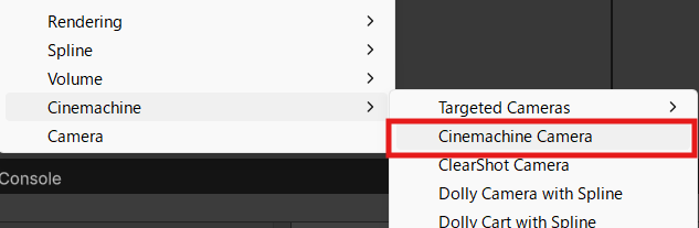 Hierarchyの右クリックメニューからCinemachine Cameraを1つ配置してみます。