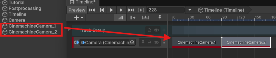今回は順番に遷移させたいので上で配置したCinemachine Cameraをドラッグして遷移させたい時間分重ね合わせるだけでOKです。