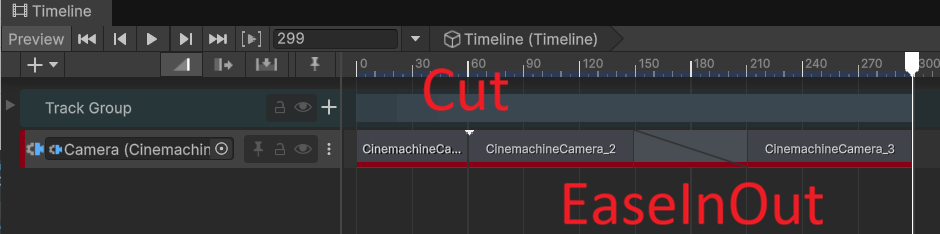 ここではさらにもう1つCinemachine Cameraを追加して、瞬時に切り替えるパターン(Cut)と、スムーズな遷移(EaseInOut)での切り替えを用意してみました。